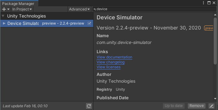 Package Manager에서 Advanced를 눌러 Show preview packages를 체크하고, Device Simulator를 설치한다.